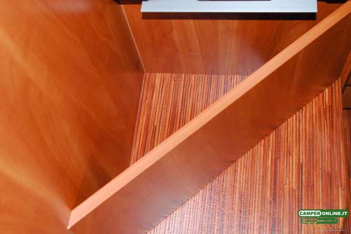 Ispirati fortemente all’ambiente nautico, gli interni sono realizzati in multistrato nobilitato con spessori variabili tra 12, 16 e 24 mm a seconda degli elementi coinvolti.