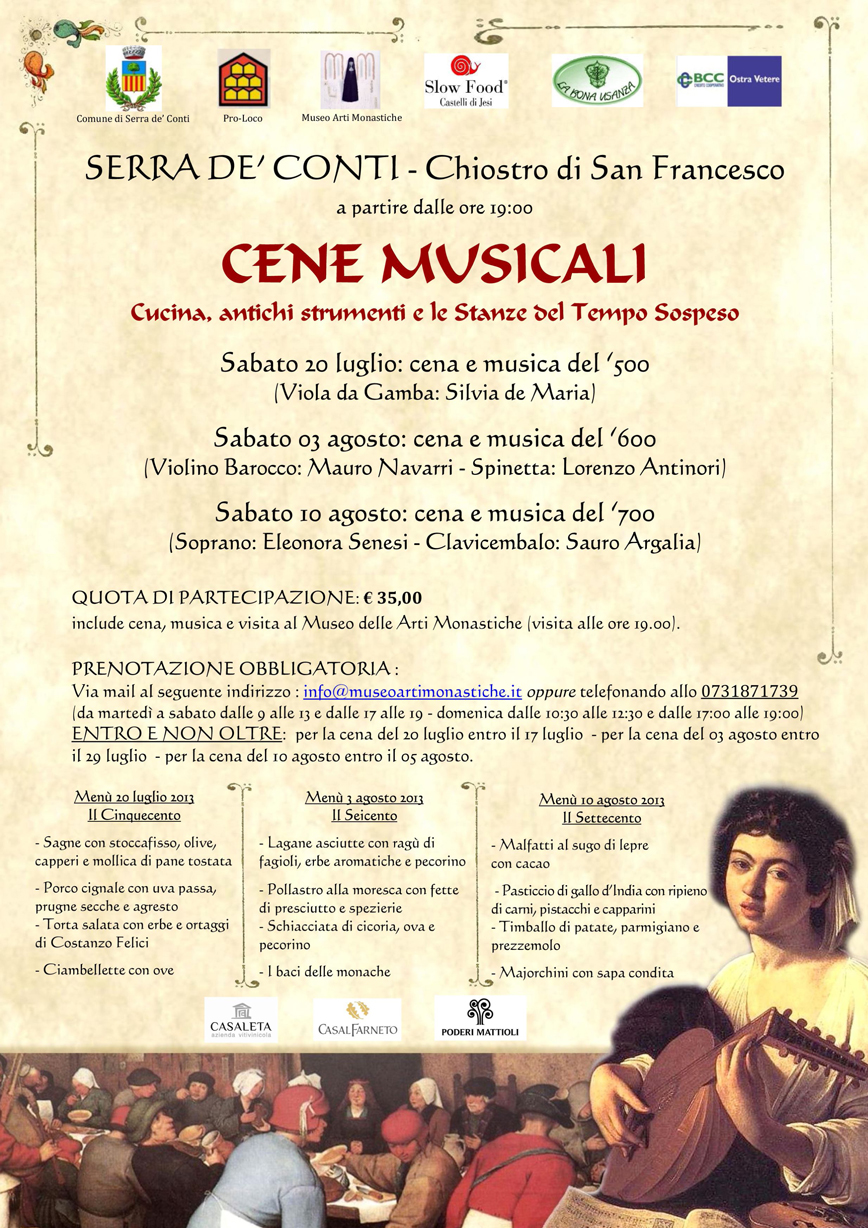 Sabato 3 agosto, sarà tutto dedicato al Barocco il secondo appuntamento con le “Cene Musicali” proposte dal vivace centro in provincia di Ancona: un salto all’indietro nel ‘600 all’interno di una cornice davvero particolare, il Museo delle Arti Monastiche col suo giardino panoramico sulle circostanti colline e il Chiostro di San Francesco. Con le “Cene Musicali”, promosse dal Comune di Serra de’ Conti e dalla direzione del Museo, e organizzate dalla Pro-Loco in collaborazione con Slow Food, Serra de’ Conti dedica tre serate a differenti periodi storici, e propone i piatti tipici di allora accompagnati dalla musica del tempo, con strumenti e repertori che ripropongono le sonorità dei corrispondenti periodi.