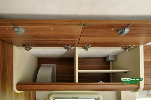 La costruzione generale, abbastanza curata, offre cerniere DGN a doppia molla in acciaio inox e maniglie cromate in metallo, mentre non sono presenti le mensole interne (salvo il pensile laterale destro del blocco cucina) e, soprattutto, le pratiche areazioni anticondensa che in inverno favoriscono la circolazione dell’aria e l’omogeneità della temperatura in ogni angolo del veicolo. Presenti, invece, i classici gommini antivibrazione, due per ciascuna anta.