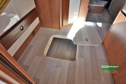 Da questa parte del veicolo si accede anche al vano principale dedicato allo stivaggio: si tratta di un gavone alto 18 cm, riscaldato da una bocchetta dedicata, che sfrutta tutta l’ampiezza del doppio pavimento lasciata libera del serbatoio di recupero. Lungo di 184 cm e largo al massimo 100 cm (81 in corrispondenza dell’apertura), è accessibile anche dall’interno, nella zona cucina, tramite una botola nel pavimento da 34×34 cm.