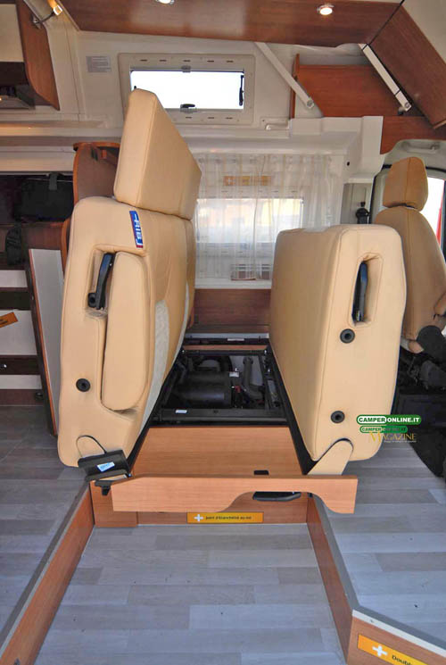 La parte più qualificante dell’allestimento per quanto riguarda la “zona giorno” è la panchetta reversibile della francese RIB che, grazie alla dotazione di grandi poggiatesta coadiuvati da cinture di sicurezza a tre punti e dei braccioli regolabili, alla possibilità di scorrere in senso longitudinale e alla conformazione erogonomica e sagomata delle sedute e dello schienale – regolabili anche in altezza e inclinazione – è in grado di garantire ai passeggeri di ogni “stazza” una posizione in marcia ottimale e sicura.