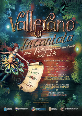 Una fiaba natalizia illuminata dalla cornice naturale di uno dei più bei borghi storici d’Italia, nel cuore della Tuscia. E’ questa l’atmosfera gioiosa che caratterizzerà Vallerano Incantata per ogni week-end fino al giorno della Befana; iniziativa che scalderà, con luci, colori e scenografie suggestive, il clima delle Feste, lungo un percorso disseminato di mercatini e presepi nel cuore del centro storico.