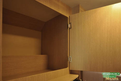 Il pensile superiore ha un’anta da 98×38 cm e uno spazio interno non partizionato da 98x38x35 cm, mentre nella colonna posta a fianco del mobile cucina, sopra il frigorifero Thetford N3000 da 175 litri, è disponibile un ulteriore vano con anta da 48×44 cm e vano di 55x54x51/34 cm.
