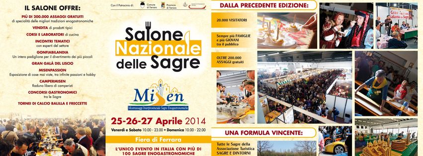 Il 25, 26 e 27 aprile torna al Quartiere Fieristico di Ferrara il Salone Nazionale delle Sagre e Misen, più di novanta Sagre provenienti da ogni parte d’Italia e oltre 300.000 assaggi gratuiti di specialità enogastronomiche nostrane.