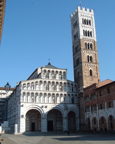 Il Duomo, situato quasi a ridosso delle mura, colpisce per l’insolita asimmetria della facciata (l’arcata di destra è più piccola), per l’incisione di un grande labirinto e per la sua posizione defilata rispetto alla piazza. L’interno, in puro stile gotico, con un imponente navata centrale, custodisce pregevoli opere d’arte, tra cui l’Ultima cena di Jacopo Tintoretto, e due capolavori: l’antico crocifisso del Volto Santo (o Santa Croce) e la tomba di Ilaria del Carretto realizzata da Jacopo della Quercia.