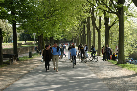 La città di Lucca è una delle principali città d’arte italiane, famosa sopratutto per la sue mura rinascimentali, intatte e tuttora pedonali (in passato furono addirittura usate come viale di circonvallazione per il traffico), che circondano il centro storico con un perimetro di circa 4 km. Percorrendole, a piedi (circa un’ora), in bici o con i pattini, è possibile apprezzare uno splendido panorama con vista dall’alto sui giardini e sulle ville presenti all’interno, riposarsi e fare pic-nic nelle aree attrezzate dislocate lungo il percorso.