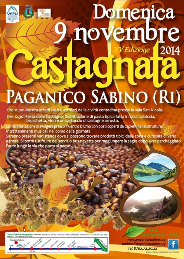 Il 9 novembre alla festa di Paganico Sabino (RI) le caldarroste verranno servite nel classico cartoccio insieme alla pasta fatta in casa, alle salsicce, alle bruschette e all’immancabile vino rosso. Ma il ricco programma prevede anche visite guidate all’interno del piccolo borgo