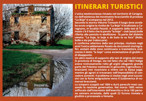 La data di presentazione di questa iniziativa, non a caso, è stata fatta coincidere con la Festa degli Innamorati: 14 febbraio, San Valentino. Il perché lo ha spiegato bene il Sindaco di Ceregnano, Ivan Dall’Ara: «Anche fare gli amministratori richiede una buona dose di amore. Ed è con amore che ci siamo avventurati nel progetto “Ceregnano: momenti di felicità tra storia e natura”, che è stato finanziato dal Gal della Regione Veneto con il contributo del nostro Comune». Il Sindaco ha anche messo l’accento sulla questione dei finanziamenti europei che non sono una chimera tant’è che «Abbiamo in mente altri progetti da presentare in Regione per ottenere finanziamenti europei, ricordo ad esempio che abbiamo già ottenuto 200mila euro per il Museo della Boje, movimento bracciantile nato proprio a Pezzoli nel 1884. Il nostro obiettivo è quello di riscoprire il nostro territorio e cercare di promuoverlo, oltre a quello di renderlo più bello e più visibile».Ceregnano_itinerari