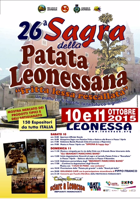 A Leonessa (RI) dal 10 al 11 ottobre si svolge con il consueto, ricchissimo programma di spettacoli e intrattenimento la 26 Edizione della Sagra della Patata, protagonista di molti piatti semplici e prelibati, cucinati secondo le ricette di un tempo.