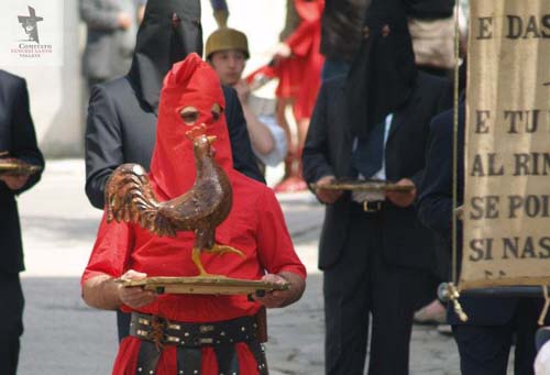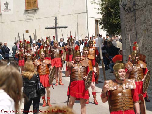 La tradizione vuole che i giovani si vestano da soldato romano in costume da littore o da centurione, come prova di iniziazione attraverso l’esibizione fisica, sfidando i rigori di una primavera che quasi sempre tarda a venire in un paese di 870 m s.l.m., Per questi giovani , la maggior parte ancora imberbe, che cominciano ad affacciarsi alla vita adulta, indossare una corazza e sfilare tra la folla, che assiste al lento dipanarsi della rappresentazione religiosa, rappresenta un’occasione in cui anche loro denunciano la propria esistenza alla comunità. Fino a qualche anno fa v’era la corsa a suon di soldi, precedentemente a sacchi di grano, per portare la statua del Cristo e lo stendardo dell’aquila latina.
