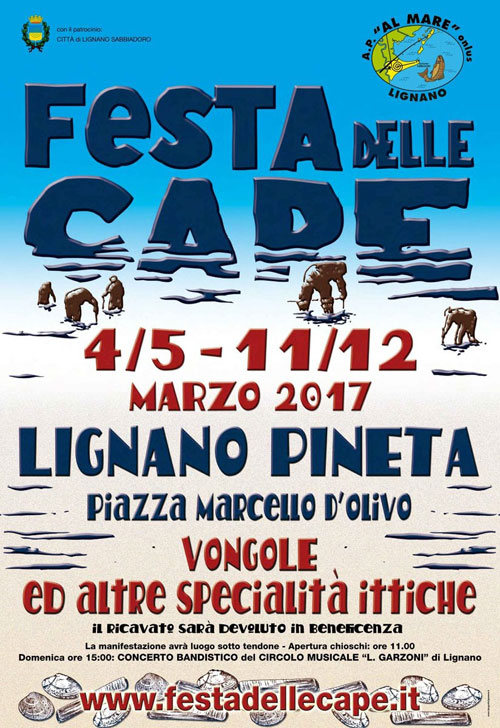 A Lignano Pineta (UD), in Piazza d’Olivo, fervono i preparativi per la 33 eEdizione della “Festa delle Cape che dal 4 al 12 marzo, per due fine settimana, allieterà la località balneare e inaugurerà una stagione ricca di eventi. La sagra, nata nel 1984 per iniziativa di alcuni pescatori professionisti, ha il duplice scopo di far conoscere i prodotti ittici del mare dell’Alto Adriatico a residenti e turisti e, soprattutto, di destinare gli incassi ed il ricavato in beneficenza.