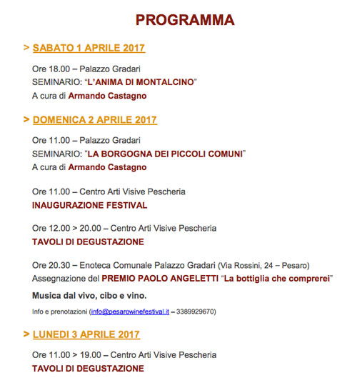 Fare click sul seguente link per accedere al sito oppure telefonare o inviare un mail ai seguenti contatti: +39 0721 387445 e-mail: info@pesarowinefestival.it