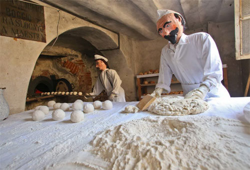 Bambini seduti nei banchi di legno di una scuola immaginaria, il panettiere che impasta e inforna le pagnottelle, i contadini intenti a mungere e un fotografo che immortale due fratelli che partono per l’America. Ogni scena è accompagnata da strumenti da lavoro e ambientazioni d’epoca.