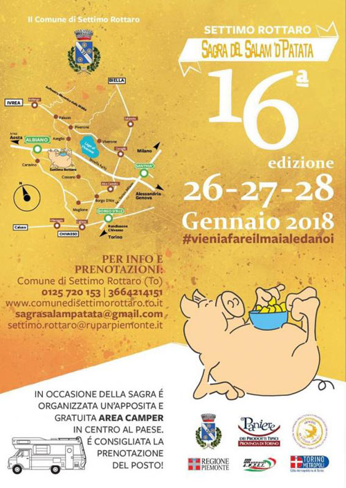 A Settimo Rottaro (TO), durante il fine settimana del 26-28 gennaio, si svolgerà la XVI edizione della Sagra del Salam’d Patata, un evento che si basa sulla produzione di un tipico insaccato della tradizione culinaria “povera” canavesana.