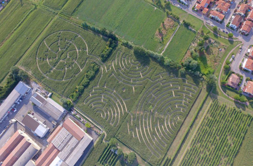Il primo, “piccolo”, labirinto effimero nel campo di mais è stato realizzato da Carlo Galassi nel 2007. Labirinto che già nel 2008 e 2009 era cresciuto superando i 40.000 mq e potendosi vantare del titolo di primo labirinto effimero d’Italia. Nel 2010 l’incontro fra Galassi e Luigi Berardi, noto artista e punto di riferimento per il disegno di labirinti anche a livello internazionale, che di anno in anno hanno poi collaborato per connotare i labirinti con tematiche sempre più profonde e complesse: “La Ruota del tempo” (2010, 60.000 mq che l’ha reso anche il più grande d’Europa, fino al 2014); “Il Basilisco” (2011, 80.000 mq), “L’alba dell’uomo” (2012, 80.000 mq), “Il volo dell’ape regina” (2013, 80.000 mq) “Metamorfosi” (2014, arrivando addirittura a 10.000 mq) e “L’albero della vita” (2015, 10.000mq). Nel 2016 inizia poi una nuova avventura con i labirinti effimeri e dimanici: “Sentieri Peregrini”, “Sospesi tra terra e cielo” (2017).