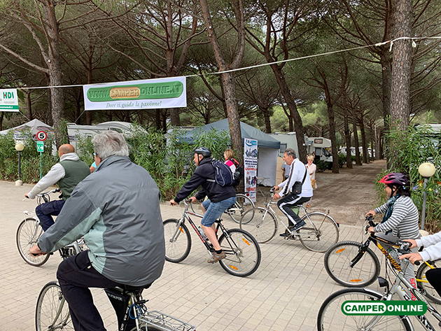 Una volta completata l’accoglienza degli equipaggi, presso la nostra postazione, con la consegna del welcome kit, generosamente offerto da Thetford e Teleco, gli equipaggi informati del programma si sono dedicati alle più svariate attività di svago e relax, in attesa degli impegni di sabato: prendere il sole sulla spiaggia del campeggio o in piscina, passeggiare nella splendida pineta, raggiungere in bici o a piedi la vicina Marina di Cecina oppure visitare, in bicicletta o in moto, i borghi circostanti.