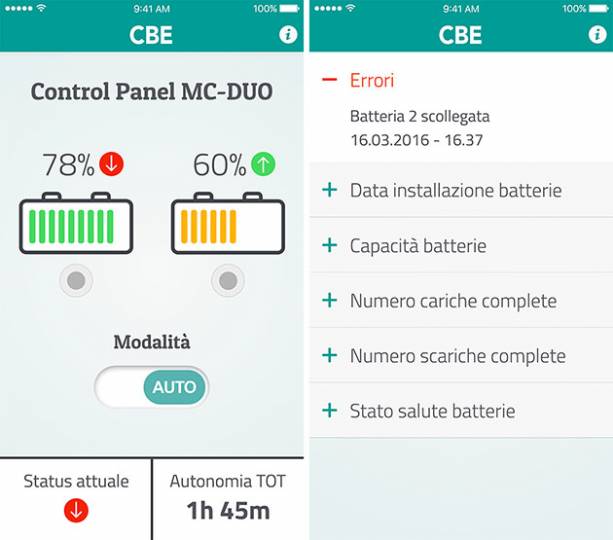 App CBE per iOS e Android, che offre moltissime funzioni. Si può selezionare tra modalità di funzionamento (Manuale o Automatica), visualizzare in tempo reale i valori di carica o di scarica delle batterie o calcolare l'autonomia energetica: una volta impostate la capacità e l’età delle batterie, l’App è in grado, tramite un algoritmo, di calcolarne la capacità residua.