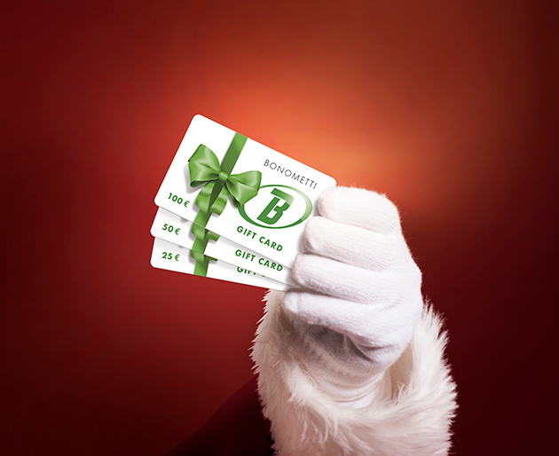 Gift Card Bonometti. Proposta con 3 diverse fasce di prezzo (25, 50 e 100 Euro), consente a chi la riceve in dono di acquistare il prodotto, o i prodotti, che preferisce presso il Market Accessori della concessionaria Bonometti di Altavilla Vicentina, e non solo a Natale, ma in qualsiasi momento dell’anno.