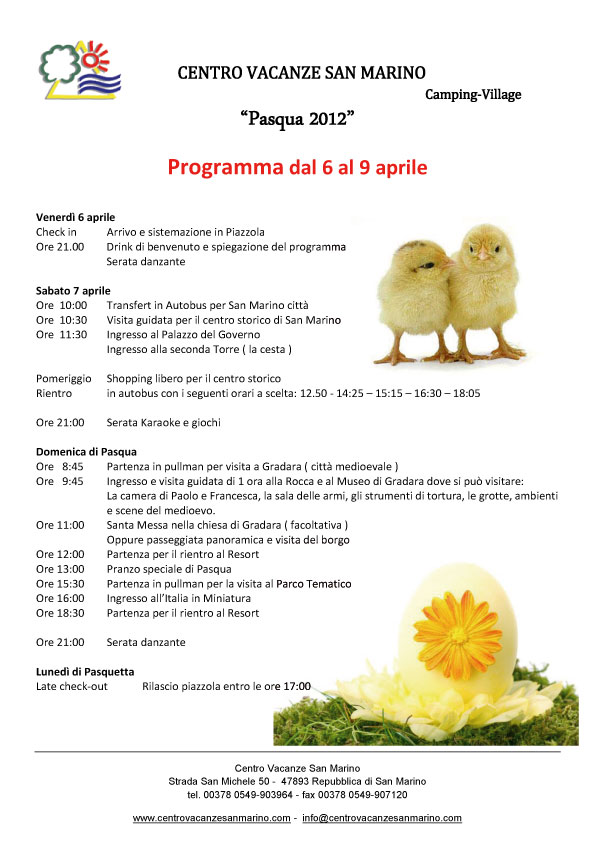 Le festività pasquali si avvicinano: quest'anno sfruttate l'occasione per scoprire San Marino! Il Camping Village Centro Vacanze San Marino, infatti, dal 6 al 9 Aprile organizza un raduno presso la propria struttura dedicato a tutti coloro che desiderano scoprire la più antica Repubblica al mondo!