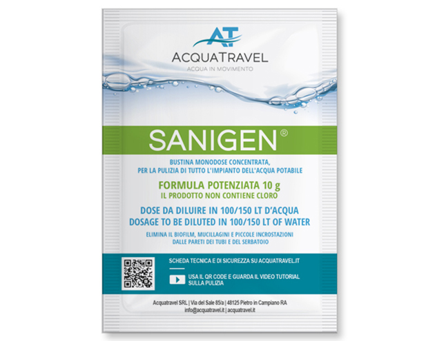 Sanigen Acquatravel, una bustina monodose concentrata per la pulizia di tutto l’impianto dell’acqua potabile del veicolo.