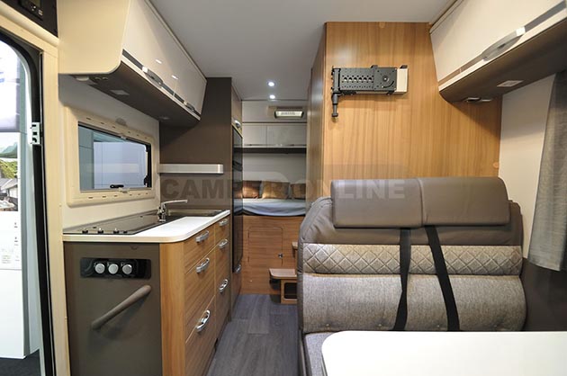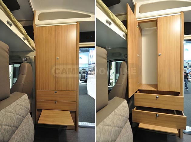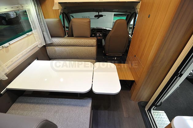 All’interno, infatti, l’ormai diffusissimo living integrato con la cabina di guida lascia il posto a una dinette dall’impostazione classica, servita da un tavolo ancorato a parete, dotato di prolunga estraibile, e fronteggiata da un ampio armadio guardaroba a doppia anta. Nella sua parte inferiore, oltre a due capienti cassetti, è stata poi ricavata una tavoletta ribaltabile che può fungere da piccolo puff aggiuntivo.