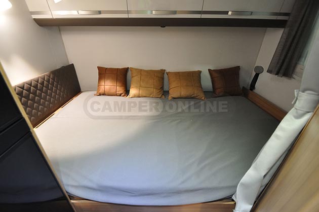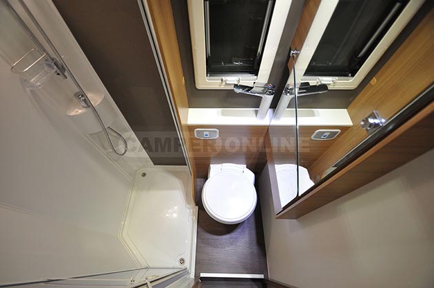 La zona posteriore, è invece occupata dal letto matrimoniale trasversale, regolabile in altezza in funzione delle necessità di carico del sottostante gavone garage e accessibile anche dall’interno mediante un piccolo sportello dedicato mentre, al centro dell’abitacolo, si sviluppano i servizi. Questi si compongono di un blocco cucina lineare, affiancato dal frigorifero a colonna, e da un locale bagno sviluppato in un unico ambiente, ma dotato di box doccia separato al suo interno.