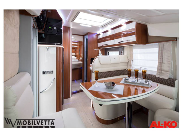 AL-KO, offre maggiore stabilità, maggiore sicurezza alla guida, una grande capacità di stivaggio grazie al doppio telaio passante riscaldato che permette di alloggiare il serbatoio acque grigie e acque chiare. Motorhome con ampio letto centrale saliscendi elettrico posteriore, bagno e doccia separati. Garage di generose dimensioni. K-Yacht 85 Teknoline: Motorhome con letti gemelli posteriori, bagno con cabina doccia indipendente dal vano wc-lavabo, maxi saloon e generoso garage che può contenere uno scooter.