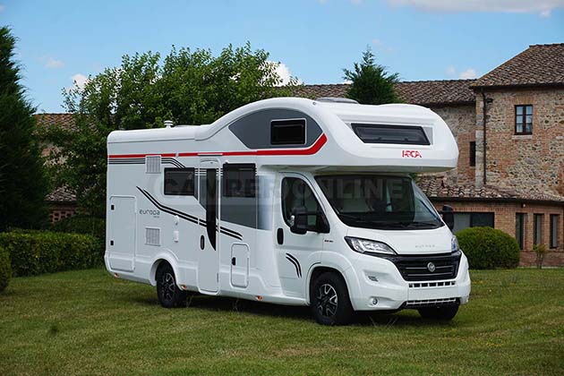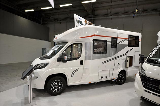 Europa H 699 GLG, su Fiat Ducato, propone i letti gemelli posteriori longitudinali. La toilette compatta offre spazi separati per la doccia e un living di discreta vivibilità pur nelle dimensioni più compatte, essendo il veicolo sotto i 7 metri. Garantita la privacy per tutto l’equipaggio grazie agli ambienti anteriore e posteriore separati. Da sottolineare anche la possibilità di portarsi dietro nel maxi gavone biciclette o scooter.