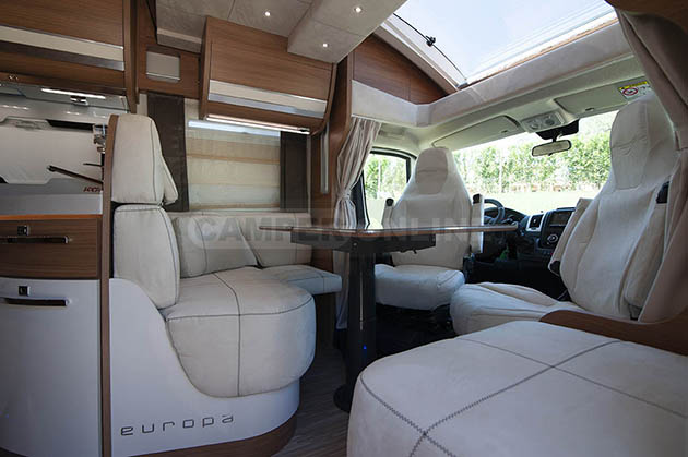 Europa P 615 GLM, con letto trasversale posteriore, grande garage e dinette per 4 persone in solo 6,15 metri.