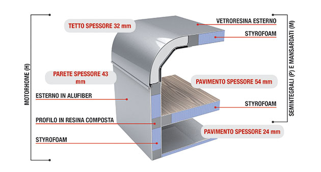 pareti di 43 mm, tetto di 32 mm e pavimento di 54 mm. Esternamente inoltre la giunzione fra parete e tetto è realizzata tramite accoppiamento di due profili in estruso di alluminio con materiale isolante interno a garanzia di solidità strutturale e protezione dall’esterno. Infine il doppio pavimento, tecnico nei semintegrali e mansardati, con telaio Al-Ko per i motorhome, contribuisce grazie all’intercapedine ad isolare completamente la cellula abitativa dall’esterno, riducendo così le dispersioni termiche.