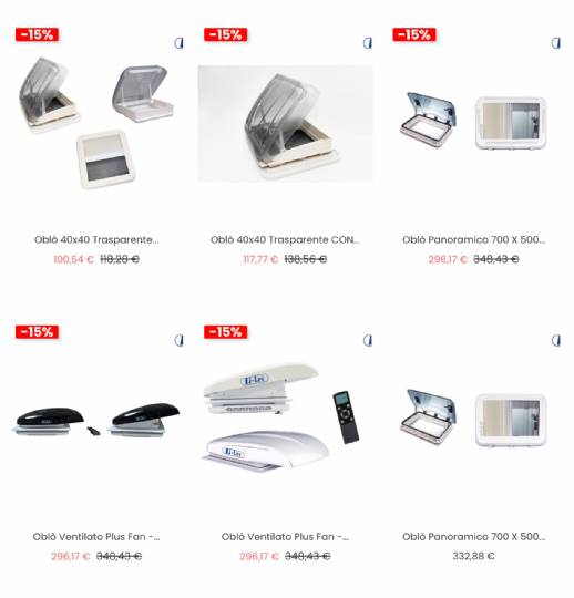Ci sono i classici oblò da 40x40 cm, quelli panoramici da 70x50 cm e non mancano i modelli Plus Fun (bianco o nero) che integrano una ventola e sono dotati di luci perimetrali. Gli oblò Plus Fun hanno un particolare design aerodinamico che ne permette l’apertura per la ventilazione anche a veicolo in movimento.