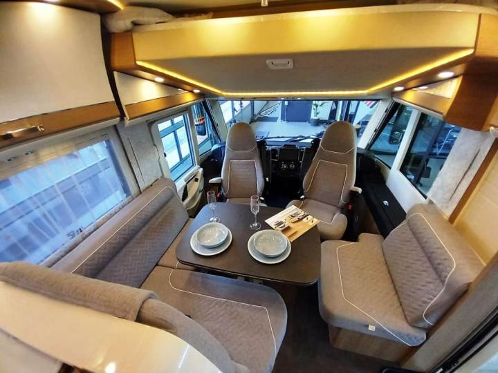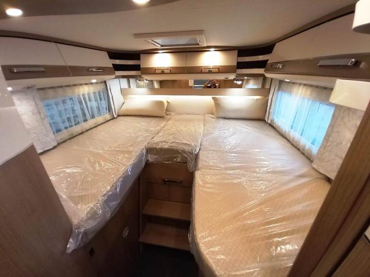Lo schema abitativo è dei più collaudati e richiesti, caratterizzato dalla comoda zona notte posteriore con letti singoli gemellati. Ma questo veicolo si fa notare anche per la notevole capacità di stivaggio interna offerta dagli armadi. Il bagno integra la doccia (separabile mediante paretine scorrevoli), mentre la cucina è ad angolo. Il living offre cinque posti a sedere perché oltre alla semi-dinette a L mette a disposizione una poltroncina laterale e i sedili girevoli della cabina. Non manca il letto matrimoniale basculante, che scende per la notte sopra la cabina di guida. Da notare che il veicolo disponibile nello show room di Barbera Caravan è già dotato di batteria al Litio, per una grande autonomia energetica.