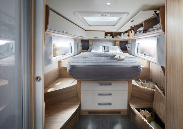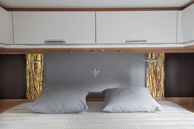 Il letto centrale della zona notte dispone di tre ampi cassetti frontali, completi di chiusura centralizzata elettrificata, e può essere raggiunto facilmente grazie al grande spazio disponibile. I pensili, presenti a soffitto lungo tre lati, permettono uno stivaggio confortevole e diversificato, mentre le due ampie finestre laterali simmetriche permettono di inondare di luce naturale questo ambiente rendendolo ancora più accogliente. Per i più romantici ed esigenti, poi, è disponibile a tetto un maxi oblò panoramico: vedere le stelle cadenti, ammirare il cielo ed esprimere i propri desideri diventa subito realtà.