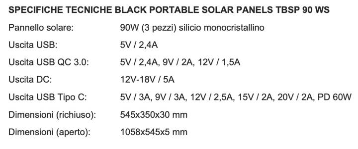 Teleco Group, è un pannello monocristallino pieghevole diviso in tre parti che una volta chiuso ha un ingombro di 54 centimetri per 35, con uno spessore di 3. Da aperto è in grado offrire una potenza di 90 watt, che eroga a 12 o 18 volt fino a 5 ampère attraverso uscite DC, USB, QC 3,0 e USB. Tutto quello che bisogna fare per ottenere il massimo rendimento dal pannello è aprire la comoda valigetta e orientarlo in maniera perpendicolare al sole utilizzando l’apposito cavalletto. Una volta aperto il pannello è sufficiente connettere il cavetto USB del dispositivo elettronico alla rispettiva porta di uscita disponibile (DC, USB, QC 3.0 e Tipo C) e le batterie cominceranno a ricaricarsi poco a poco.