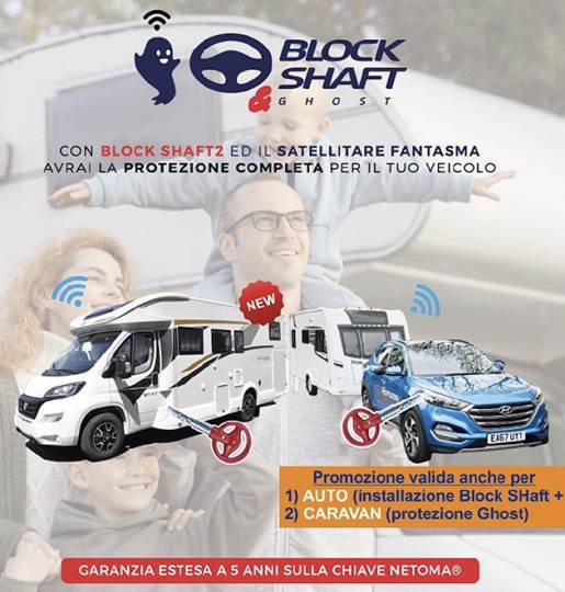 Non solo, per il massimo della sicurezza il costruttore propone in promozione l’abbinamento tra Block Shaft 2 e Ghost, il sistema satellitare “fantasma”. Un’abbinamento che mette al sicuro da qualsiasi violazione del veicolo e viene proposto anche per le caravan. E’ infatti attiva una promozione per l’installazione del satellitare Ghost sulla caravan e dell’antifurto meccanico Block Shaft sulla vettura trainante.