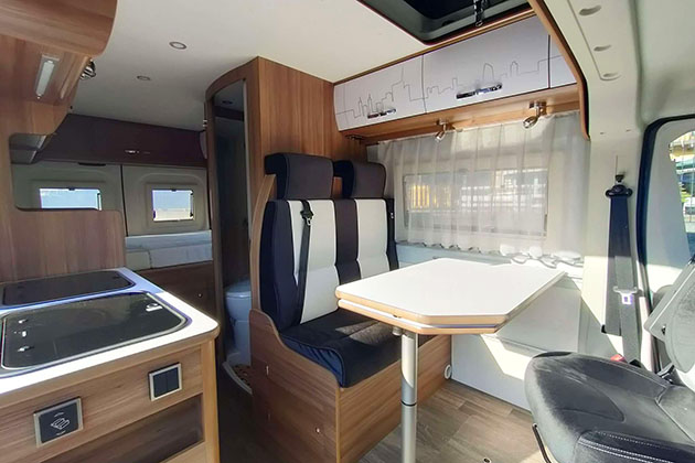 Bravia Mobil aggiungono un arredo interno robusto e ben rifinito. Abbiamo potuto osservare da vicino alcune varianti del modello Swan 599 da 599 cm di lunghezza, disponibile in versione standard e nelle varianti Trend e 30 Edition. Le meccaniche disponibili sono quelle del Peugeot Boxer e dell’Opel Movano. Lo schema abitativo del Bravia Mobil Swan 599 è classico, con il letto matrimoniale trasversale in coda, ma non mancano soluzioni particolari, come quella del bagno.