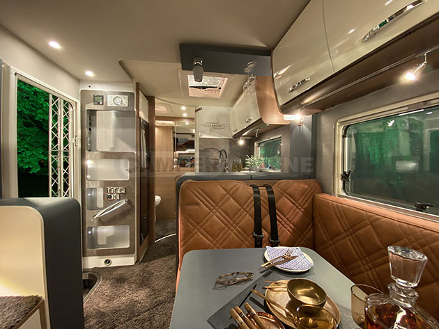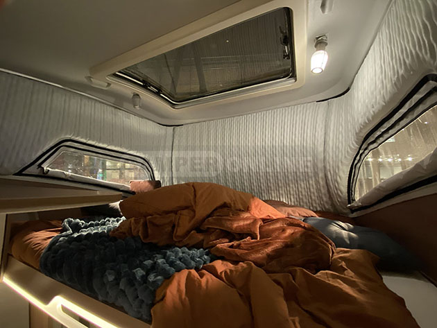 Insolito è anche lo sviluppo dell’abitacolo interno, votato all’eleganza e al design. Anteriormente, oltre a una classica semidinette integrata con la cabina di guida, lungo la fiancata destra è stata posizionata una scala fissa che consente un comodo accesso al letto matrimoniale, inserito a sua volta in ambiente arioso e molto spazioso. E’ provvisto di bocchetta del riscaldamento dedicata, due finestre laterali con zanzariera ricavate nelle camere d’aria perimetrali e tetto panoramico.