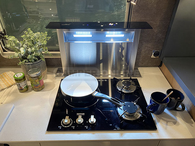 Innovativa anche la cucina, sviluppata a “L” con annesso mobile bar, dove è stato integrato un apposito vano dotato di meccanismo sali-scendi elettrico che integra la macchinetta del caffè. Ritroviamo infatti soluzioni come la chiusura elettrificata dei cassetti inferiori, una cappa aspirante a scomparsa integrata nella superficie del piano – anch’essa dotata di meccanismo sali-scendi elettrico – e un gruppo cottura che integra assieme due classici fuochi a gas e una piastra a induzione. Non manca, poi, un elemento superiore sporgente al quale poter ancorare magneticamente lampade amovibili e calici.