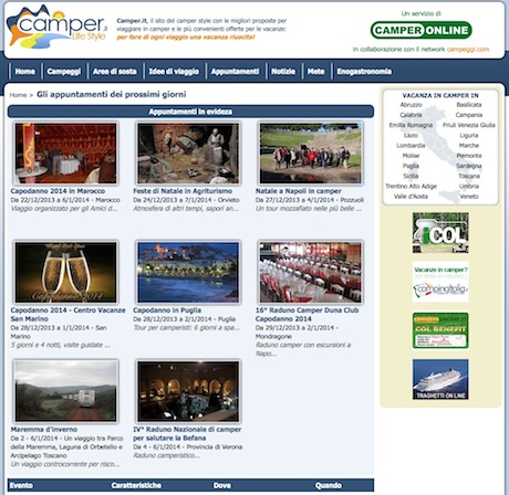 Camper.it propone mete, appuntamenti di ogni genere e per ogni preferenza: enogastronomia, turismo culturale, turismo termale, relax, divertimento, scoperta naturalistica e molto altro ancora: tutto quello che Enti, Parchi, Pro loco e organizzazioni attive sul territorio sono in grado di offrire.