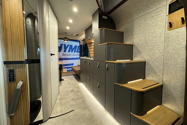 Hymer Grand Canyon S Crossover invece è un van da 593 cm di lunghezza, con uno schema abitativo classico (letto matrimoniale trasversale posteriore, living anteriore, servizi al centro) ma dotato di tetto sollevabile, meccanica 4x4 e un esterno di grande impatto.