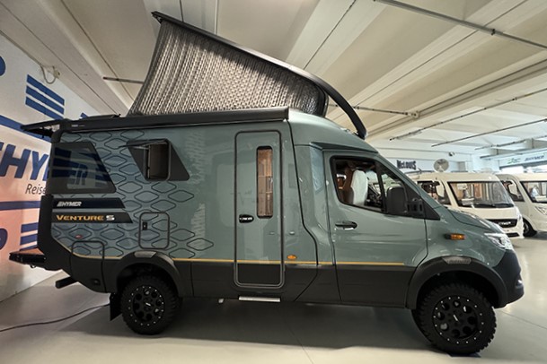 Hymer Venture S è un camper fuori dal comune, uno dei camper più singolari di tutti i tempi, anche uno dei più costosi se rapportiamo il prezzo alle dimensioni. Un mezzo eslcusivo, destinato a chi non si accontenta di un camper tradizionale, se pur di gamma alta. E’ un semintegrale piuttosto compatto, meno di 6 metri e mezzo di lunghezza, quindi piuttosto maneggevole su strada e anche sugli sterrati. La capacità di affrontare percorsi non convenzionali è garantita dalla meccanica Mercedes Sprinter 419 CDI a trazione integrale, con il potente motore da 190 cv, il cambio automatico e la trazione integrale.