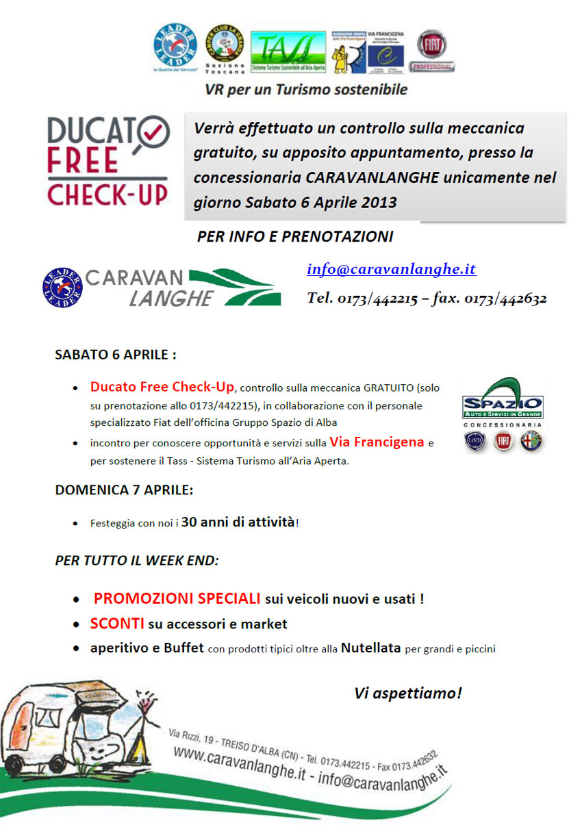Sabato 6 Aprile sarà infatti possibile far effettuare il Ducato Free Check-Up, controllo gratuito sulla meccanica, prenotabile contattando direttamente Caravan Langhe, e approfondire le opportunità e i servizi legati alla Via Francigena, mentre domenica 7 Aprile si terranno i festeggiamenti per il trentennale dell'attività di Caravan Langhe.