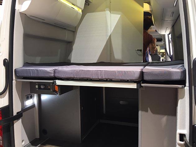 VW Crafter con una lunghezza di sei metri e motorizzazione base da 2 litri e 130 CV, propone un allestimento completo di letto matrimoniale trasversale posteriore con ampio vano di carico sottostante, toilette completa, cucina e soggiorno con semidinette, il tutto completato da un secondo matrimoniale basculante anteriore.