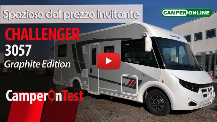 Abbiamo testato il Challenger 3057 Graphite Edition, top di gamma della casa francese. E’ un motorhome di generose dimensioni, che garantisce ampi spazi interni, ma che si propone sul mercato con un prezzo non elevato se rapportato ai vari modelli che affollano la categoria dei motorhome a scocca integrale. Ha una lunghezza che sfiora i 7 metri e mezzo, offre quattro posti viaggio omologati e ha tre posti letto, che arrivano a cinque scegliendo il letto basculante anteriore proposto in opzione. Ecco quindi che il Challenger 3057 Graphite Edition diventa interessante per due persone che vogliono stare comode, ma che ogni tanto hanno anche il piacere di avere a bordo uno o due ospiti. Il garage non manca, mentre a bordo abbiamo una comoda zona notte posteriore e un altrettanto comodo living con dinette face-to-face.