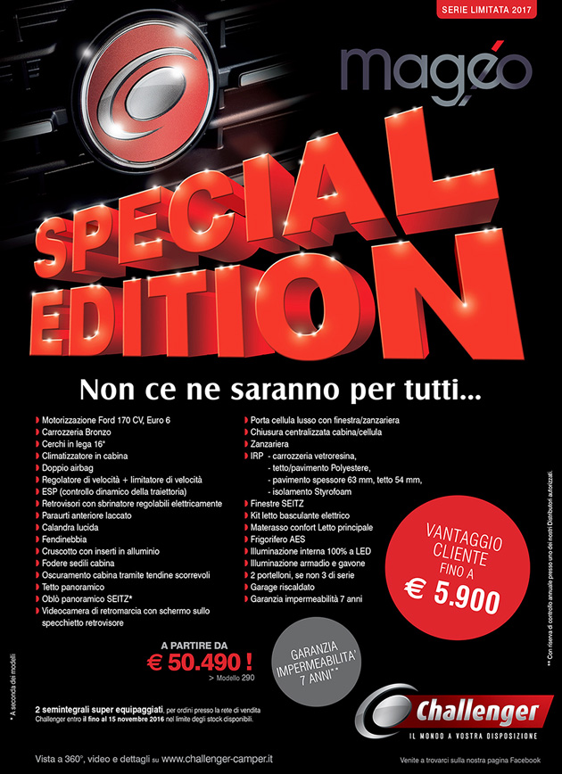 Special Edition”, semintegrali della gamma Mageo proposti, di serie e in edizione limitata, con un lunghissima serie di equipaggiamenti che partono dalla meccanica di base Ford Transit con motorizzazione da 170 CV Euro 6 completa di climatizzatore, vetri e specchi elettrici, chiusura centralizzata porta cabina e cellula, cerchi da 16”, fendinebbia, paraurti verniciato doppio Airbag, Cruise Control ed ES