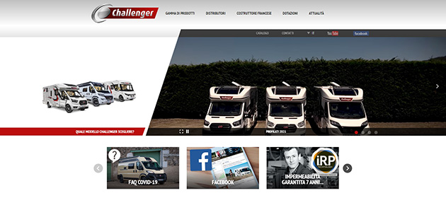 www.challenger-camper.it, con funzionalità sempre più intuitive e facili da utilizzare. Dalla home page ricca di contenuti e richiami ai plus del marchio, tra cui uno slide-show dove spiccano alcuni video aziendali, si raggiungono facilmente tutte le sezioni desiderate. Dalla parte dedicata alla