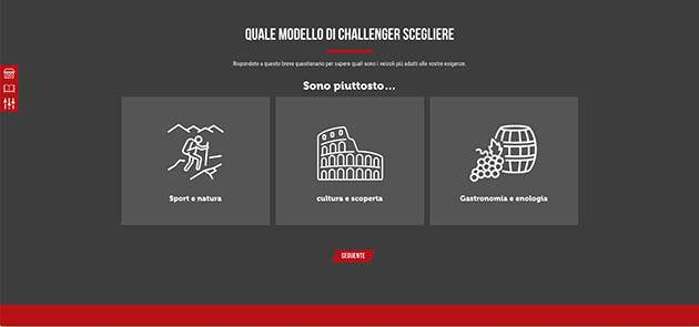 Challenger, nella sua sezione denominata “guida all’acquisto”, fa un passo avanti in questo argomento, facendo partire la configurazione del proprio veicolo ottimale direttamente dalla selezione dei propri interessi turistici predominanti, siano essi rivolti alla sport, alla cultura e alla scoperta o all’enogastronomia.