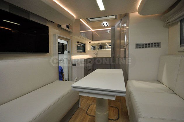 Il design prevede un living ampio e “flessibile” dove tutti gli elementi sono trasformabili: tavolo, letto e divano. In particolare quest’ultimo si trasforma in letto matrimoniale tramite uno meccanismo di sollevamento manuale semplice e rapido, tipico dei nostri divani di casa. La progettazione ergonomica e volumetrica degli interni e dei mobili è studiata al servizio della massima abitabilità. Anche i colori degli interni e le finiture dei materiali giocano sui toni chiari di tendenza rendendo gli ambienti più luminosi. Le dotazioni sono efficienti come il frigorifero a compressore da 165 litri che offre performance assimilabili al frigorifero e congelatore di casa. Da segnalare infine i piani di tavolo, cucina e toilette realizzati in Fenix, un materiale che, sfruttando le nanotecnologie, assicura proprietà antibatteriche, resistenza ed eventuale facilità di riparazione in caso di necessità.