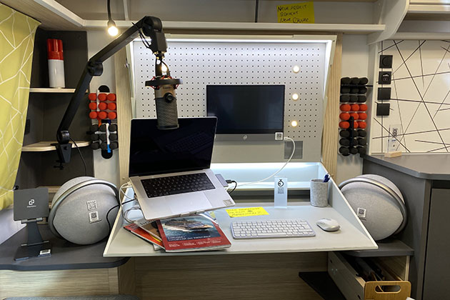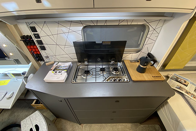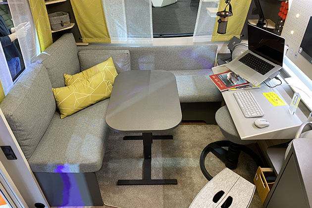 L’interno riprende lo schema del modello base, ma in un angolo del living è stata creata una completa zona di lavoro, dotata di scrivania Beaktor “conference” e sedute ergonomiche da uffficio Aeris Swopper. Per ottenere una perfetta connessione internet è previsto il pacchetto Stream&surf-net 2.0 di Antretter&Huber. Nella zona giorno resta comunque disponibile una spaziosa dinette a L (trasformabile in letto), mentre al centro dell’abitacolo è collocata una cucina ben sviluppata, con il frigorifero accanto alla porta d’ingresso, raggiungibile anche dall’esterno grazie all’anta a doppia apertura.