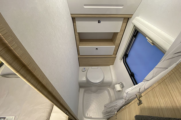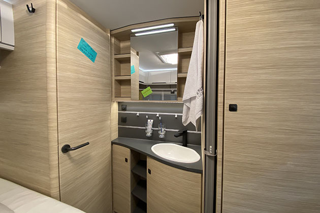 Il bagno è sdoppiato, per la massima flessibilità d’uso: c’è un vano chiuso che raggruppa wc e doccia, ma c’è anche un mobile lavabo esterno con specchiera. Tanto spazio, quindi, a bordo di questa caravan, spazio da inventare ogni volta per assecondare le varie esigenze di svago e di lavoro.